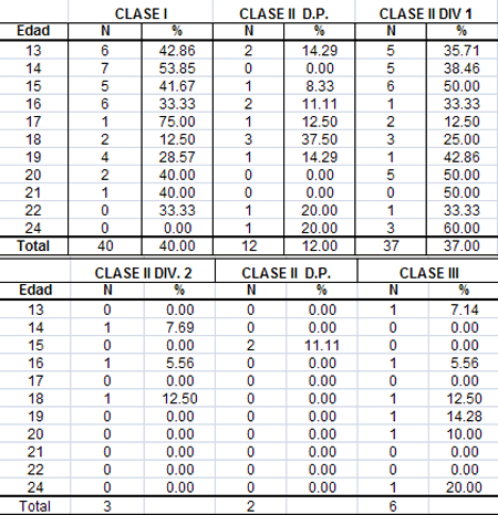 Las Tablas I y II muestran la distribución de la muestra según el tipo de maloclusión y de acuerdo a la clasificación de Angle y del patrón esquelético respectivamente. La Tabla III describe estadísticamente la distribución del tipo de maloclusión por edad y la IV muestra todas las variables utilizadas en el estudio. Al no encontrarse diferencias por edad y sexo, se entregan sus resultados en conjunto: