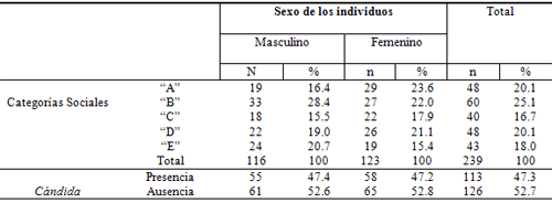 Las muestras de la saliva fueron colectadas, procesó y el número de UFC/mL de células de levadura fueron mensuradas, así como la identificación de las especies. Respecto al número de los individuos portadores de Cándida y el porcentaje de incidencia de estos microorganismos por categoría socioeconómica, la Tabla II presenta los resultados de los escolares, divididos en sus respectivos niveles socioeconómicos. Entre la muestra masculina (116), 28.4% de los individuos pertenecen a la categoría socioeconómica "B", y las otras categorías socioeconómicas presentaron valores de 20.7%, 19%, 16.4% y 15.5%, para las categorías E, D, A y C, respectivamente. Sin embargo, con relación al sexo femenino(123), podría verificarse que 23.6% fueron representados por individuos que pertenecen a la clase socioeconómica A, y el otro percentil de 22%, 21.1%, 17.9% y 15.4% para las categorías socioeconómicas B, D, C y E, respectivamente.