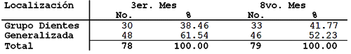 Con relación a la localización de la alteración, en los dos períodos de gestación considerados en el estudio, preponderó la gingivitis generalizada; aunque para el octavo mes se observó una ligera tendencia al decrecimiento de esta condición (Tabla No. 5).