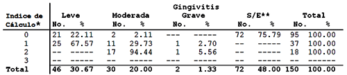 Se identificaron 78 (52.00%) y 79 (52.67%) casos con gingivitis en el tercero y octavo mes de gestación, respectivamente; predominando la gingivitis leve en el tercer mes y moderada en el octavo mes de embarazo (Tabla No.4 y Gráfico No. 1). No se observaron diferencias significativas en el grupo con relación al incremento de la patología en el octavo mes, sin embargo es evidente la agudización de la enfermedad en esta etapa; los porcentajes para gingivitis moderada y grave se incrementaron en ese momento.