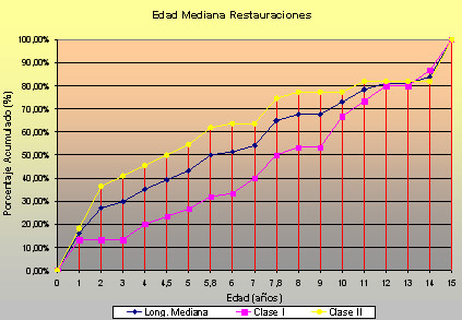 La edad mediana o longevidad mediana de las restauraciones fue de 7,8 años. La mayor longevidad se observó en restauraciones de clase I, 7.8 años. En Clase II la longevidad mediana de las restauraciones fue de 4,5 años (gráfico 1).
