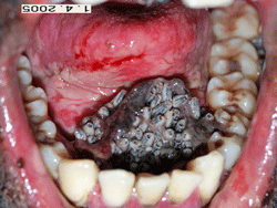 O termo miíase, derivado do grego "myia" significando mosca, é usado para definir a invasão dos tecidos do corpo ou cavidade de animais vivos por larvas;(1) que por um certo período alimentam-se de tecidos vivos ou necrosados, substâncias líquidas do corpo ou alimentos ingeridos.(2) A miíase oral é uma condição rara que pode manifestar-se em bolsas periodontais, feridas resultantes de extrações dentárias, feridas abertas em geral, podendo localizar-se em diversas regiões da cavidade bucal.(3) O diagnóstico é baseado no quadro clínico e as larvas podem ser identificadas através de exame laboratorial. O tratamento deve ser direcionado à remoção total das larvas, além do uso de quimioterápicos. O objetivo deste trabalho é descrever um caso raro de miíase em região buco-maxilo-facial em um paciente de 40 anos que evoluiu para óbito.