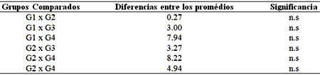 La Tabla 1 muestra los valores promedios de la adhesión para cada sistema adhesivo sometido a la prueba de cizallamiento. Se observa que el G1 presentó el mas bajo promedio (3.77), mientras que el G4 el mas alto (7.90).