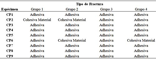 En relación a los tipos de fracturas en la interfase diente/restauración, el análisis en estereomicroscópio mostró que fracturas del tipo adhesiva fueron las mas frecuentes (88.9%, n=32), conforme puede ser visto en la Tabla 3.