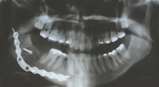 La paciente fue sometida a la remoción de la lesión sobre anestesia general. Fue empleado injerto óseo autógeno de cresta ilíaca que fue fijado con tornillos a través de la vía transcutanea con una placa de reconstrucción de titanio del sistema 2.4 mm respetando el contorno óseo mandibular, (figura 4) instalada por vía intrabucal, finalizando con la sutura de la mucosa, con hilos reabsorvibles.
