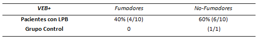 Al evaluar la relación de consumo de cigarrillos y la presencia de infección por VEB, se observó que de los 10 pacientes positivos para VEB el 40% (4/10) eran fumadores y el 60% (6/10) no presentaban este hábito. El único paciente VEB positivo del grupo control era no-fumador (tabla 3). No se observó una correlación estadísticamente significativa entre el consumo de cigarrillos, la presencia del VEB y/o la presencia del LPB.