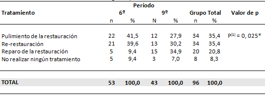 La Tabla 3 muestra la decisión de tratamiento. En el grupo total los dos tratamientos más citados fueron: "Pulimiento de la restauración" y "Re-restauración", seguido de "Reparo en la restauración". Cuando se analiza por período se verifica que las respuestas más citadas entre los alumnos del 6º período fueron: "Pulimiento de la restauración" y "Re-restauración", mientras que entre los alumnos del 9º períodos las tres respuestas más citadas fueron: "Reparo en la restauración", "Re-restauración, y "Pulimiento de la restauración". Las dos mayores diferencias porcentuales fueron registradas para "Reparo en la restauración" y "Pulimiento en la restauración" y se comprueba diferencia significativa entre los períodos en relación a los tratamientos. (p > 0,05).