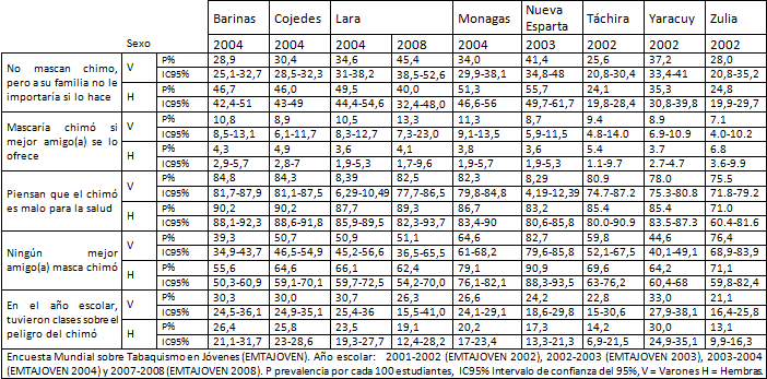 Prevalencia de algunos indicadores relacionados con el consumo de "Chimo" en Encuesta Mundial sobre Tabaquismo en Jóvenes (EMTAJOVEN) realizadas en Venezuela años 2000-2008.Encuesta Mundial sobre Tabaquismo en Jóvenes (EMTAJOVEN). Año escolar: 2001-2002 (EMTAJOVEN 2002), 2002-2003 (EMTAJOVEN 2003), 2003-2004 (EMTAJOVEN 2004) y 2007-2008 (EMTAJOVEN 2008). P prevalencia por cada 100 estudiantes, IC95% Intervalo de confianza del 95%, V = Varones H = Hembras. Discusión