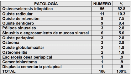 The radicular and dentigerus cyst with a percentage of 10.3% and 8.4% respectively of the whole of the finds they were the alterations that more they presented inside the alterations radiolucids, and inside the alterations radiophac the osteosclerosis idiopathic with 52.8%, the sinus polyps and thickness of the sinusal mucous with a percentage of 2.8% and 5.6% respectively. Key Words: panoramic X-ray radiographics, pathological alterations