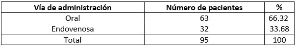 La patología asociada al tratamiento con Bisfosfonato corresponde con Osteoporosis con un 46.31% (44), seguido de Osteopenia con 16.84% (16) y en menor los pacientes automedicados con 1.05% (1) y Artritis 1.05% (1) (Tabla Nº3). Por otra parte, la vía de administración, fue oral con 66.32% (63) y endovenosa con 33.68% (32) (Tabla Nº4).