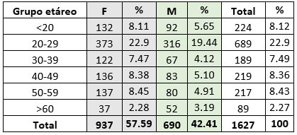 La muestra de estudio estuvo constituida por 1627 historias clínicas que cumplían con los criterios de inclusión seleccionadas de 1824 historias evaluadas, distribuida de la siguiente manera: 937 historias pertenecían al género femenino y 690 historias al género masculino. A continuación, en la Tabla I se presenta la distribución de la muestra por grupo etáreo y su relación por género, observándose mayor prevalencia en el grupo etáreo 20-29 años en ambos géneros.